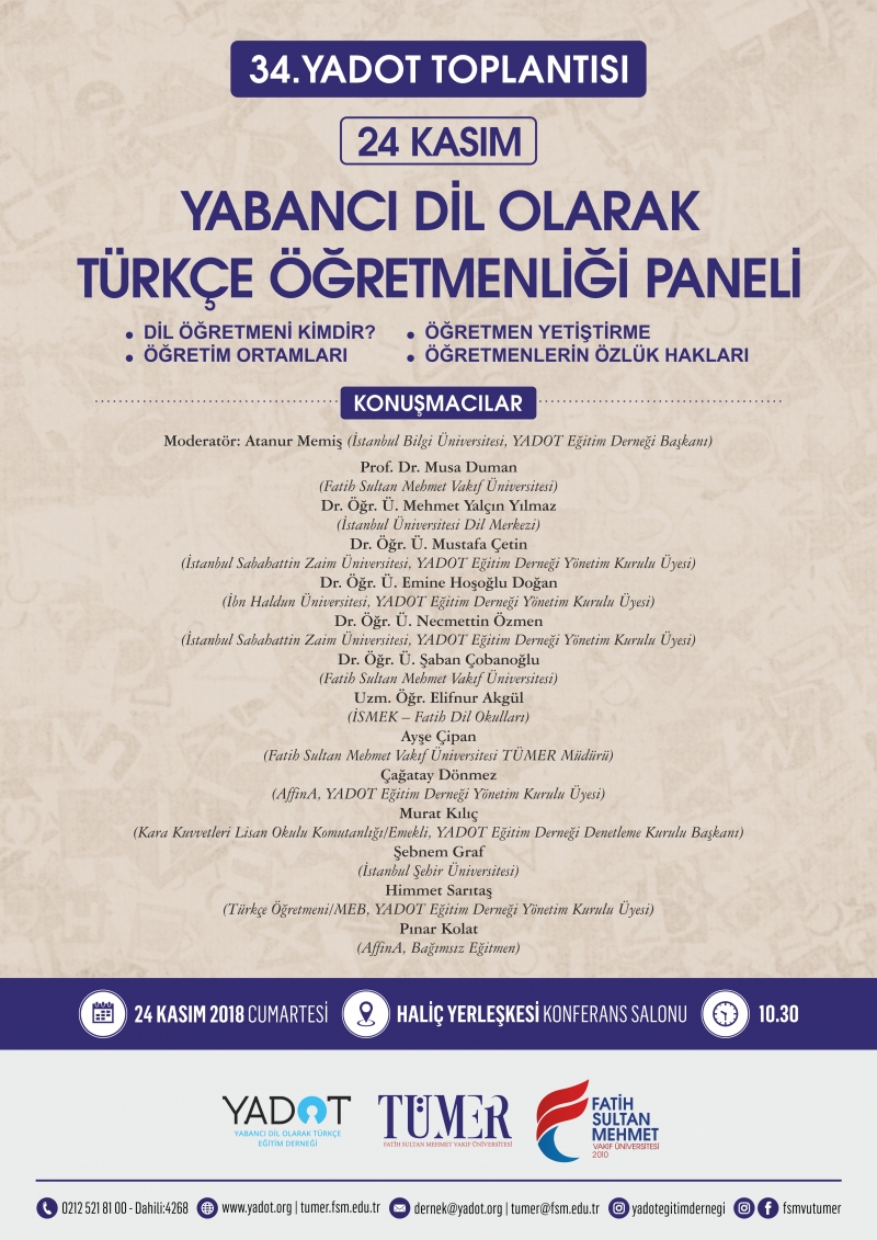 YADOT (Yabancı Dil Olarak Türkçe Eğitim Derneği) tarafından her sene düzenlenen çalışma toplantısının 34.’sü 24 Kasım Cumartesi, Haliç Yerleşkemiz konferans salonunda gerçekleşecektir.